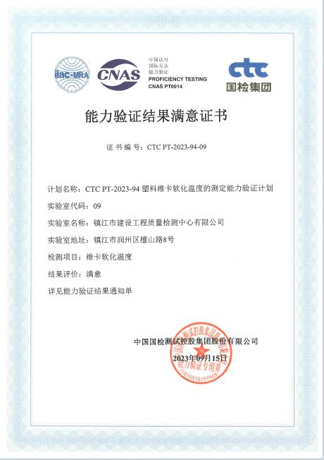 2023年5月,检测中心参加了中国国检测试控股集团股份有限公司组织的“CTC PT-2023-94塑料维卡软化温度的测定能力验证计划”,近期收到能力验证结果通知单,我中心提交的检测结果评价为“满意”(Z比分数:-0.59),顺利取得了能力验证结果满意证书。