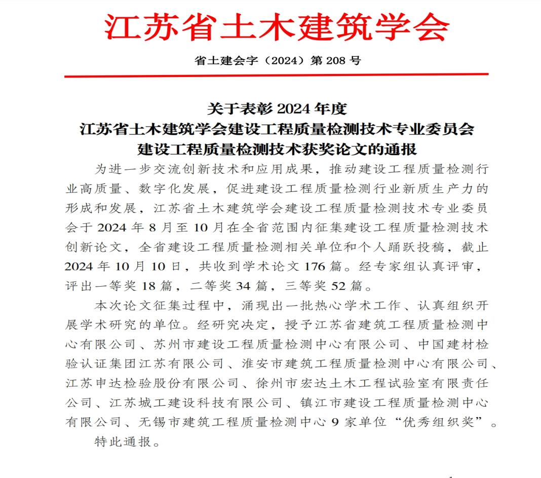 检测中心荣获江苏省土木建筑学会通报表彰