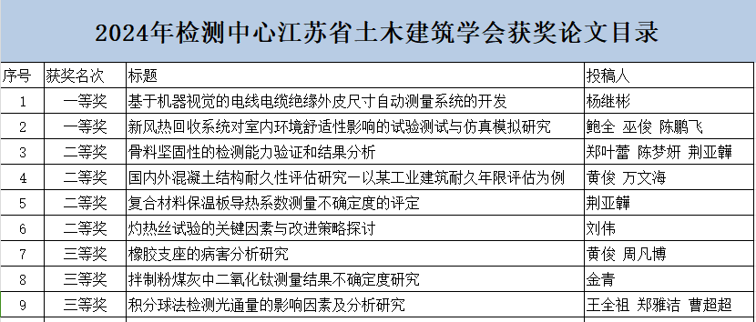 “2024年度建设工程质量检测技术获奖论文的通报”。在此次通报中,我中心收获颇丰。员工杨继彬、鲍全等人的论文成果卓越,成功摘得学会颁发的优秀论文一等奖桂冠,另有七篇论文凭借其严谨的研究与独特的见解,分别斩获二、三等奖。同时,中心还被授予