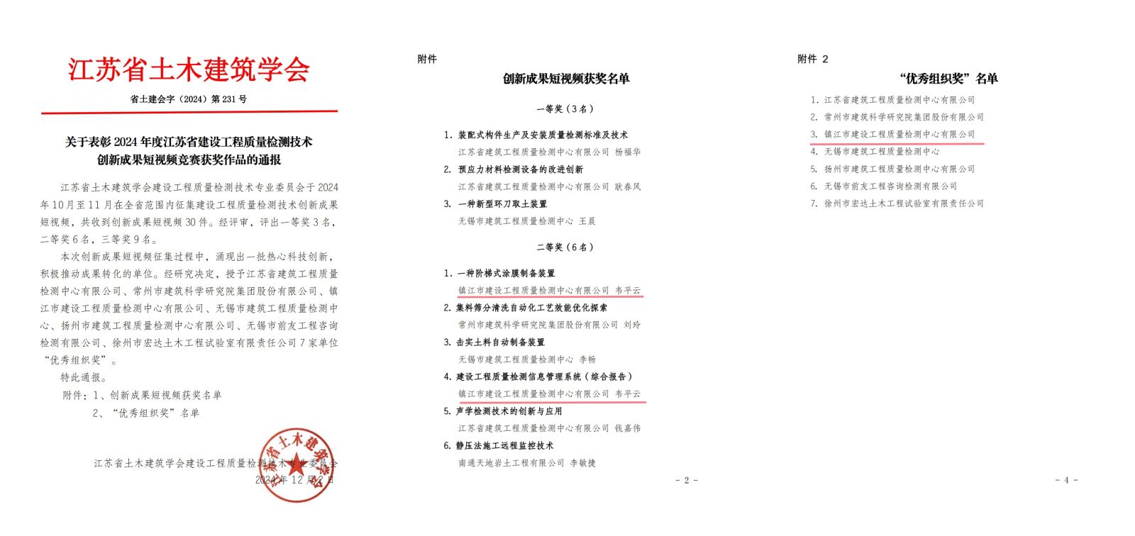 近日,在2024年度江苏省土木建筑学会建设工程质量检测技术创新成果短视频竞赛中,检测中心积极参加、精心准备,以此契机对外展示中心自主研发并已投入使用的创新成果。其中,韦平云同志制作的“一种阶梯式涂膜制备设备”和“建设工程质量检测信息管理系统(综合报告)”创新成果短视频从30件余件作品中脱颖而出,荣获两项“短视频竞赛二等奖”。同时,检测中心荣获“优秀组织奖”。